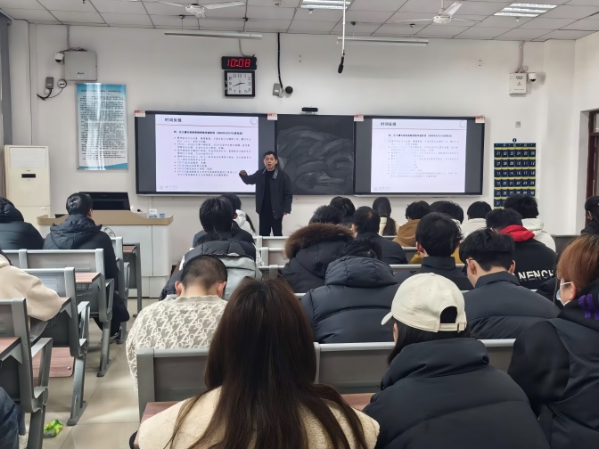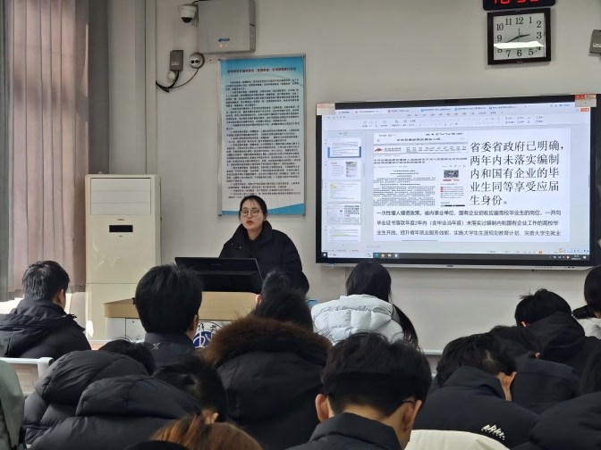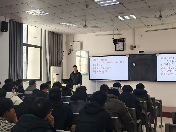 随后,2026届毕业班辅导员围绕就业工作作专项提示,分析了当前行业就业形势及班级就业现状,梳理了考研、考公、企业就业及基层服务项目等多元发展路径,提醒学生关注各渠道报名节点;同时帮助学生纠正就业过程中的认知偏差,提醒学生从正规渠道获取就业信息,再次强调实习、就业安全要求,引导学生维护自身权益、防范求职及实习风险。