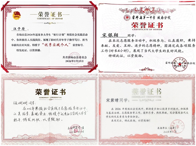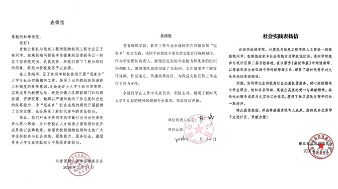 实践期间,同学们认真负责、表现突出,凭借扎实的作风和出色的表现,收获了地方单位颁发的荣誉证书、表扬信等多项认可,充分彰显了计算机与信息工程学院学子过硬的综合素质与强烈的社会责任感。