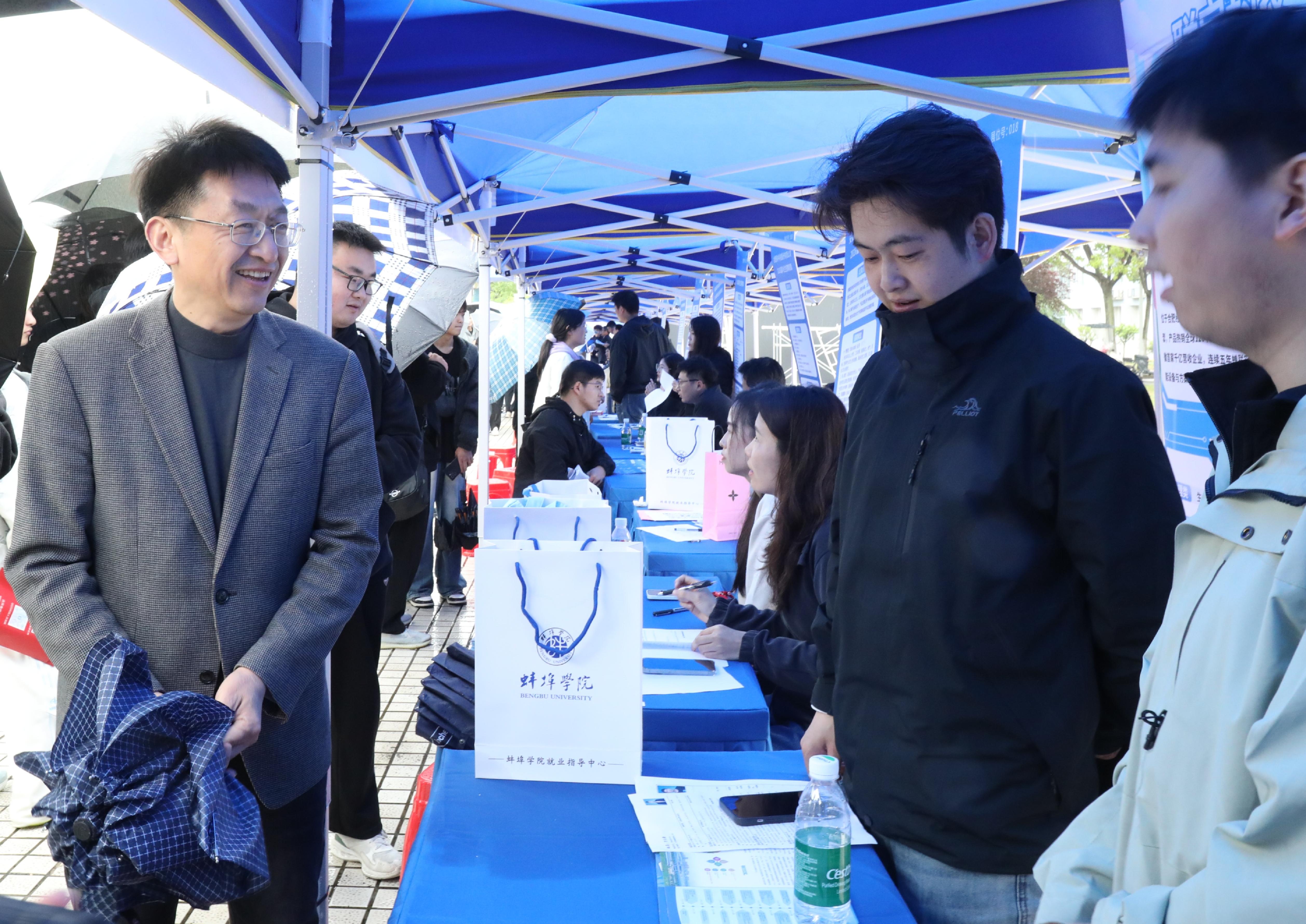 4月22日下午,蚌埠学院2026届毕业生春季校园双选会在图书馆西侧广场举行,共计218家用人单位来校选聘毕业生。党委书记陈国龙、校长张亚新、党委副书记方贤文、副校长张尔桂亲临现场指导工作。学校党委学生工作部、各二级学院负责同志,全体毕业班辅导员以及2026届毕业生参加。